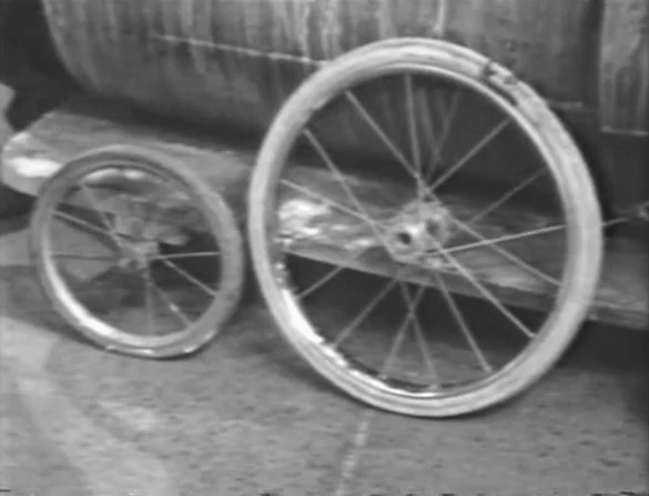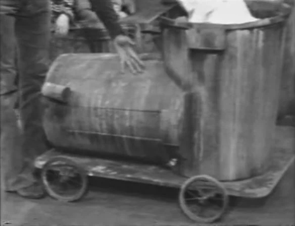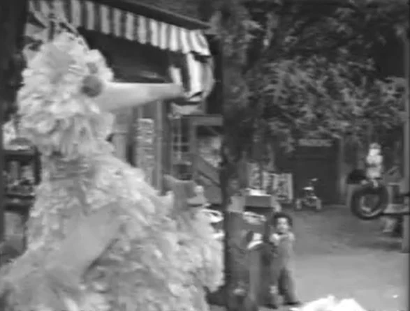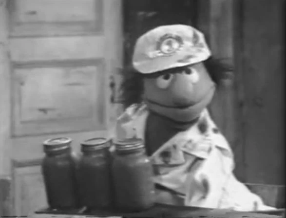 SCENE 2 | David examines the Mudmobile, noting how the body is made from two old trash cans, the headlights are tin cans, and the wheels came from a baby carriage. "Nothin' goes to waste," explains the Mudman. Oscar orders some mud, so the Mudman has two jars set out, followed by one more. Oscar wants three quarts, but the Mudman claims he doesn't have that many. David helps the Mudman add the quarts together to fulfill Oscar's order, but accidentally drops them on the ground when he tries to give them to Oscar. |