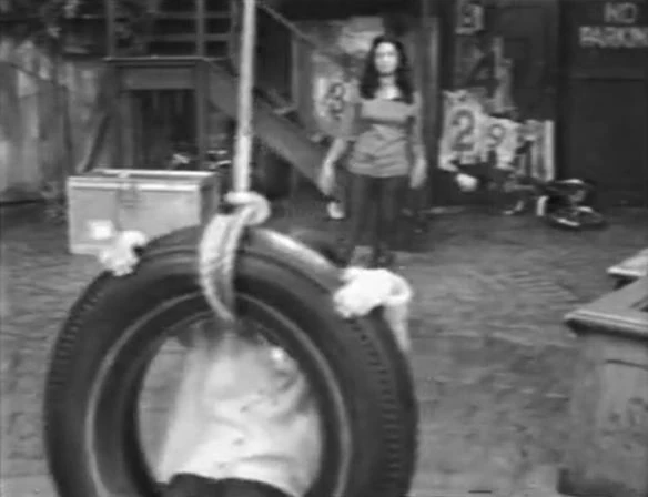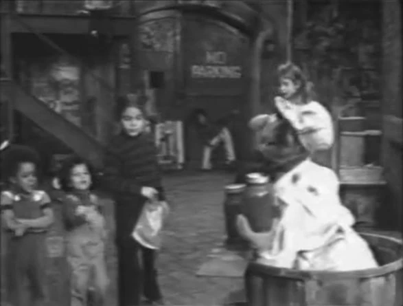 SCENE 1 | David, Oscar, and the kids listen to various sounds of the street. Oscar guesses incorrectly on the sound of Mrs. Goldman's baby and Antonio practicing his violin when they hear the sound of an odd-running truck. Oscar says this is the sound of the Mudman arriving, but David thinks they would instead hear the sounds of cans clanking. Sure enough, the Mudman arrives humming, "Come ride with me, Lucille..." as he drives past in his miniature vehicle, the Mudmobile. |