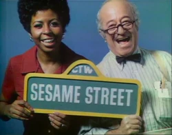 CLOSING SIGNS | Mr. Hooper and Susan hold up the Sesame Street sign, while Big Bird holds up the Children's Television Workshop sign. |