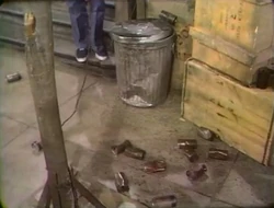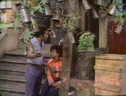SCENE 1 | Gordon and Susan water the plants on their windowsill. Oscar thinks they're yucky to look at, and tells them to get rid of them. Gordon says it's their window so Oscar doesn't have a choice. Oscar tells Joey that he thinks their flowers are stupid, and he would prefer to have something nice to look at ouside his trash can. He gets inspired when he rummages through some old, rusty tin cans, and starts pitching them onto the street. |