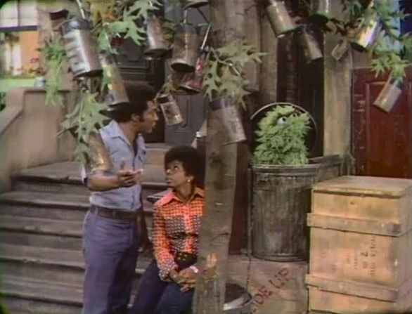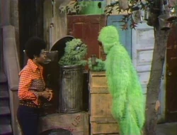 SCENE 4 | Susan checks Gordon's Grouch costume, and Gordon makes his way to Oscar's. Pretending to be Isaac the Grouch, Gordon marvels at the "tin can tree" and starts picking some off to keep, which bothers Oscar. Susan explains to "Isaac" that the cans do belong to Oscar, so "Isaac" suggests that Oscar put the cans somewhere where he can look at them real close so no one can take them. Oscar thinks that the crate next to his can is a better place to put them. |
