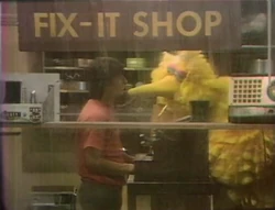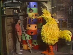 SCENE 6 | Mr. Snuffleupagus has just finished playing with Shola, so he asks Big Bird to fetch a ladder to get her down from atop Snuffy's back. The ladder breaks, so Big Bird looks for help elsewhere. Meanwhile, Snuffy and Shola notice a stack of barrels that can help Shola get down. Big Bird approaches Luis in the Fix-it Shop and asks for help. Luis sees Shola sitting on what Big Bird believes to be Snuffy, as he doesn't see him because of the construction doors. They enter, only to reveal that Snuffy is gone and Shola is sitting on the barrels instead. |