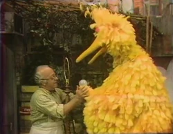 SCENE 7 | Big Bird thinks he can figure out what Mr. Hooper is doing: he has a light bulb in his hand, and he's going to screw it into the lamp. Big Bird offers to do it for him so Mr. Hooper can do other tasks, so Hooper gives him a chance and hands him the bulb. Big Bird ends up dropping the bulb while Mr. Hooper is away, and is worried that he will be upset with him. He gets an idea and runs off... |