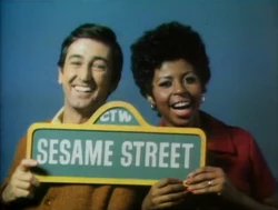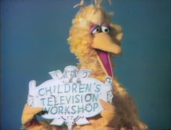 CLOSING SIGNS | Bob and Susan hold the Sesame Street sign, and Big Bird holds the Children's Television Workshop sign. |
