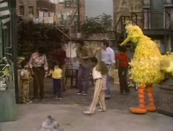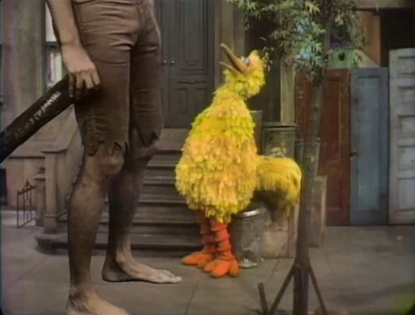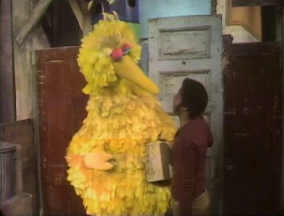 SCENE 1 | Big Bird clotheslines himself on the door frame again, explaining it's because of his big size. He compares his height to that of Tony, and notices that Gordon is bigger than Tony, but smaller than him. Big Bird figures that he's the biggest one he's ever seen, until a giant (portrayed by David) emerges and asks Big Bird for directions to the nearest beanstalk. |