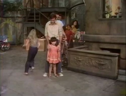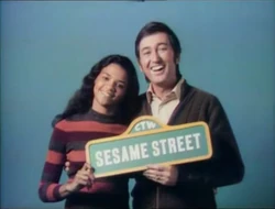 CLOSING SIGNS | Maria and Bob hold the Sesame Street sign, and Big Bird holds the Children's Television Workshop sign. |