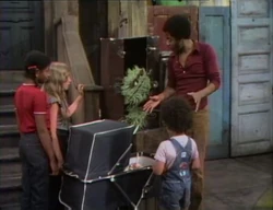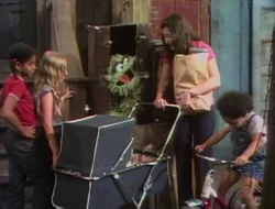 SCENE 2 | Oscar watches over a baby in a carriage, complaining how Mrs. Siegel asked him to babysit her son Stevie since nobody else was available. The baby starts to cry, which Oscar enjoys listening to. David comes over and tends to the baby, believing he's hungry. Oscar thinks that the kid can just go over to Hooper's Store, then offers him a bite of his mud sandwich. David finds the baby's milk bottle, explaining that babies can neither walk nor eat harder foods (especially ones made of mud). |