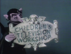 CLOSING SIGNS | David holds the Sesame Street sign, and The Count holds the Children's Television Workshop sign. |