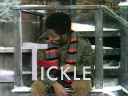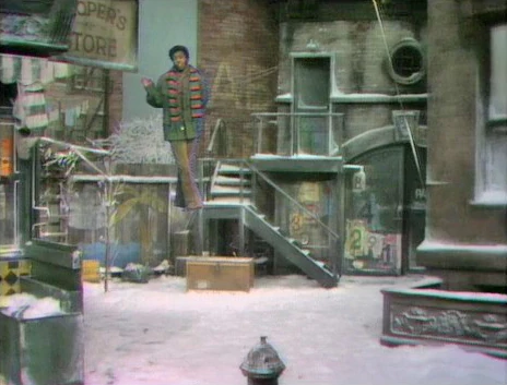 SCENE 1 | David is glad to see that the snow has stopped and tells the viewer they're just in time to learn what "next to" means. Through a series of jump-cuts, David stands next to the newsstand, the staircase, and Susan's building. When he finds himself standing in thin air next to the Hooper's Store sign, he begins furiously flapping his arms so as not to fall to the ground. |