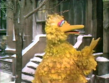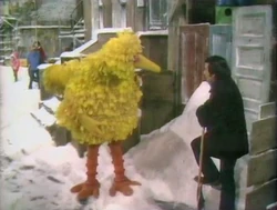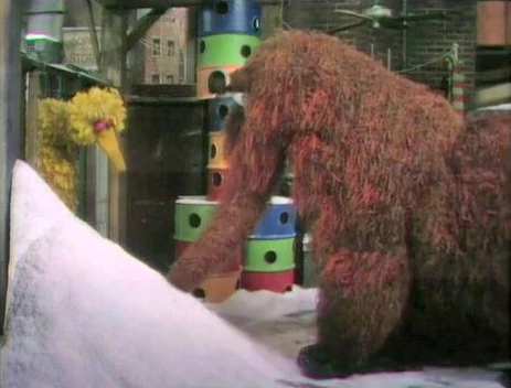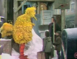 SCENE 2 | Big Bird points Bob to a large pile of snow in front of the door to his nest area, which he and the kids are trying to get rid of. He has some tools in his toolbox, but Bob tells him that a saw won't work, nor will a rake or a trowel. Bob produces a snow shovel, and proceeds to show Big Bird how it works. Since Bob is already shoveling the snow, Big Bird and the kids head to Hooper's Store for some cocoa. |