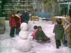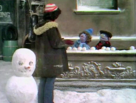 SCENE 6 | An Anything Muppet boy (Jerry Nelson) and girl (Caroll Spinney) are arguing over a snowball fight when Maria intervenes and suggests they do something together. They whisper to one another and decide to attack Maria with snowballs together. |