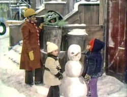 SCENE 7 | It's snowing as Luis walks in snow shoes and Susan and the kids use a discarded lampshade for the snowman's hat. Oscar announces the sponsors of today's "cold, yucchy Sesame Street." |