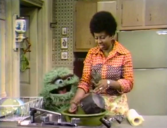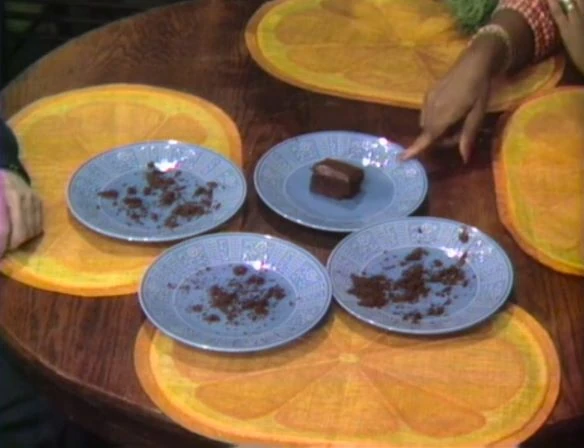 SCENE 6 | After dessert (the cake), Oscar plays a "One of These Things" game with the dishes. Three of them are empty, but one still has a cake slice on it. That one is Oscarβs, since Grouches hate cake. |