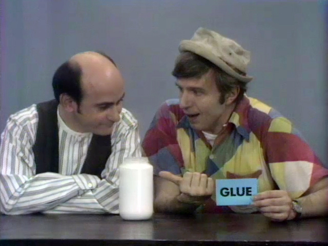 Cast | Wally and Ralph buy a large jar of glue. The jar was unlabeled, so they get a label reading "Glue." But they cannot figure out how to get the label to stick to the jar. At one point, they accidentally spill some glue on the table; they use the label to wipe it up. Still with no solution, they decide to go out to dinner. So they put the label somewhere (on the jar!) and leave. (First: Episode 0390) |