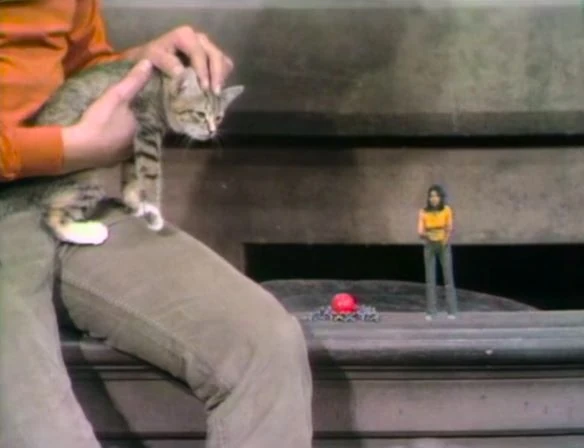 SCENE 1 | Maria and Luis greet the viewer, and Maria invites them to do some imagining with her. She imagines that she's almost as small as a group of jacks, and is worried that the enormous kitten that Luis is petting might want to eat her. |