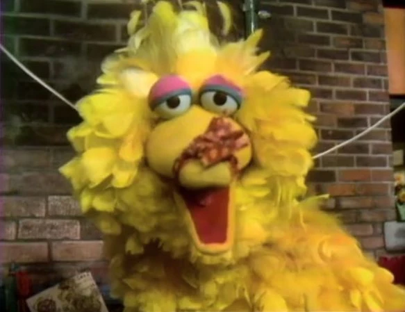 SCENE 5 | Big Bird recites a poem he wrote after pretending to be a woodpecker: he banged his beak on a tree all day, and now it's bandaged. |