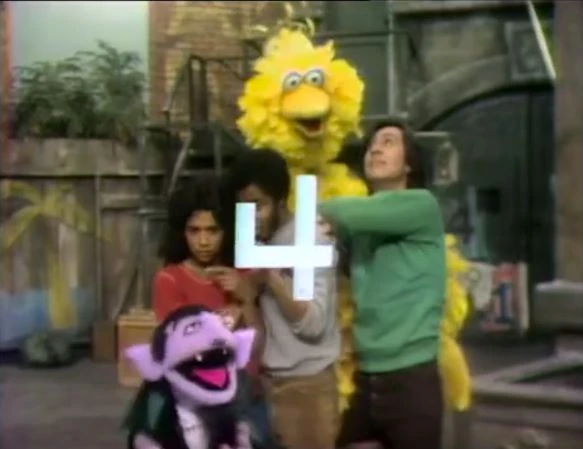 CLOSING SIGNS | The Count holds the Sesame Street sign, and David and Maria hold the Children's Television Workshop sign. |