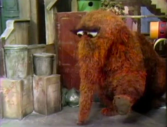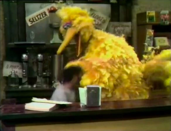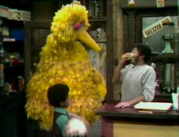 SCENE 3 | At Hooper's Store, Big Bird enters with Kwame, who has brought in his dog Potzie. David starts to sneeze, explaining to Big Bird that heβs allergic. Big Bird and Kwame agree to take the dog outside, and Big Bird decides to stand guard at Hooper's to make sure no other furry animals will cause David to sneeze. Big Bird spots Mr. Snuffleupagus coming out of his nest area, and quickly pushes David under the counter βfor his own goodβ until Snuffy passes by. David finds it ridiculous that an "imaginary" friend would make him start sneezing, and steps outside to prove it. He begins to sneeze, only because another kid at the Fix-it Shop is holding a cat. |
