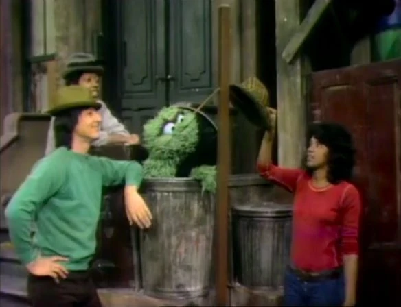 SCENE 2 | Maria, Luis, and David observe that Oscar has built a hat rack that is sitting outside his can, but the wooden pegs that are supposed to hold the hats are angled down instead of up. Oscar is well-aware of this, and gives the three of them some hats so they can pretend to be visitors. They each go to hang up their hats, which of course slide off the pegs. Oscar is delighted, because now the people who can't hang their hats will have to leave. |