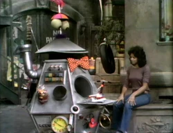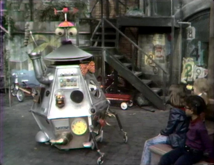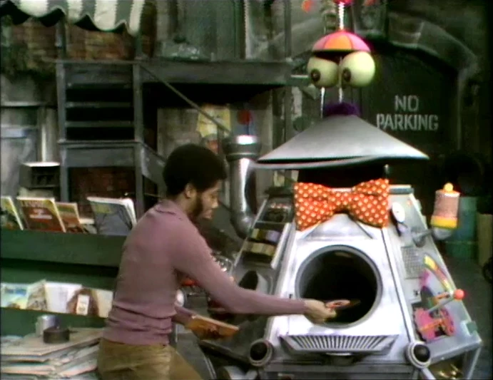 SCENE 2 | David walks home with a record he just bought. Sam the Robot offers to play it for him, citing that his father's side of the family had many record players in it. First he plays it too slow, then too fast. Sam finally plays it right, but dislikes the rock music; being a machine, he prefers a cacophony of sounds played from his various gears and parts. |