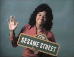CLOSING SIGNS | Maria holds the Sesame Street sign, while Bob holds the Children's Television Workshop sign. |