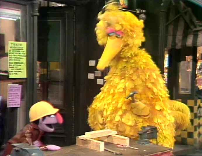 SCENE 6 | Luis is showing Big Bird how certain tools are used for a nail, a nut and bolt, and a screw, but he gets called away to the phone. Biff enters and shows Big Bird how to use a hammer, wrench and screwdriver properly. When Luis returns, Big Bird proceeds to explain to him how the pros do it. |