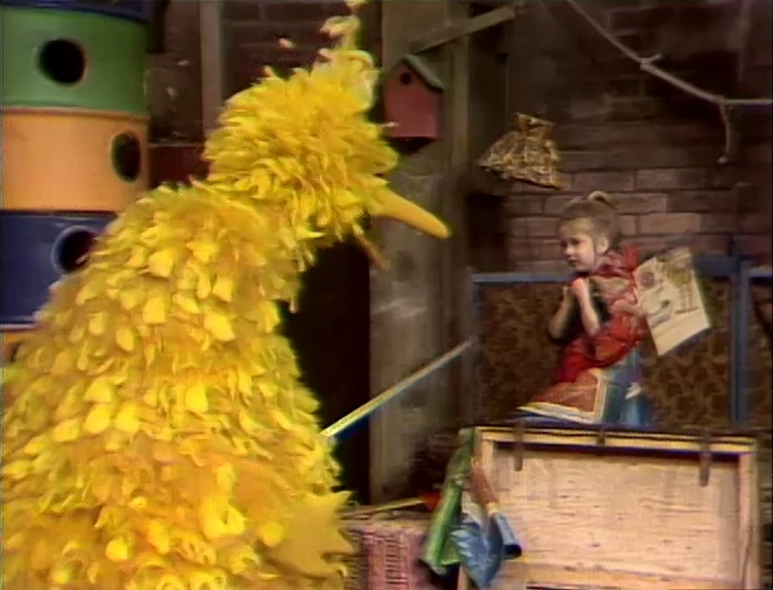 SCENE 3 | Big Bird and Joey are playing dress-up in his nest. Big Bird is a prince with a wooden sword, who wants to go out and slay a dragon; Joey is his mother who doesn't want him to go. Since there aren't any other kids around, Big Bird gives Joey a long cape and tells her to be the dragon. As the prince, Big Bird panics at the sight of the dragon and runs away. |