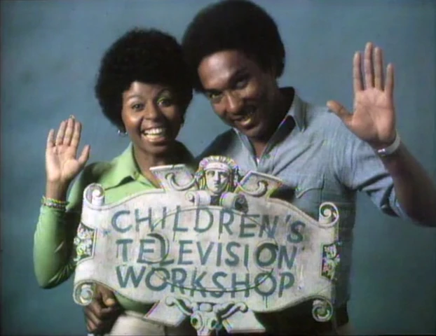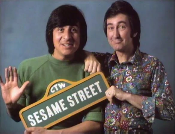 CLOSING SIGNS | Luis and Bob hold the Sesame Street sign, and Susan and Gordon hold the Children's Television Workshop sign. |