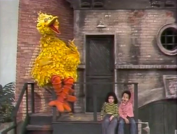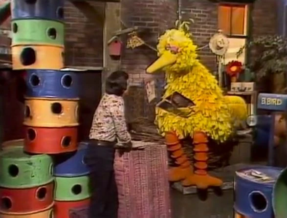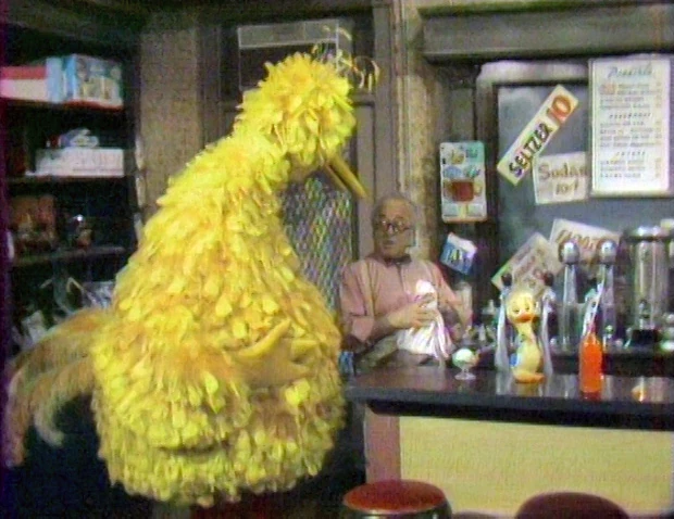 Insert | Sitting at the counter in Hooper's Store, Big Bird wonders what it would be like to be short, so he tells Mr. Hooper he's going to do some imagining. He closes his eyes and Big Bird sees himself small enough to walk around on the counter where he interacts with, compared now to his tiny stature, is a large bowl of ice cream and large squeak toy which scares him now because he's so small. When Mr. Hooper cleans up, Big Bird notes that he's now too small to notice, so he imagines himself back to reality. Mr. Hooper leans in to Big Bird from overhead to excuse himself, making Big Bird wonder if he's still imagining. The camera pulls back to reveal Mr. Hooper standing on a step ladder, and Big Bird resolves to being his normal size again. (First: Episode 0212) |