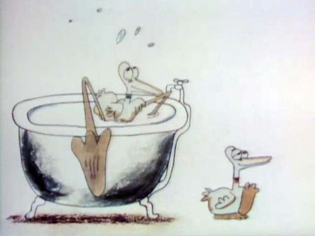 Cartoon | Two ducks look the same height when they're in the bathtub, but one duck (Joe Flynn) is short and the other is tall. (First: Episode 0303) |
