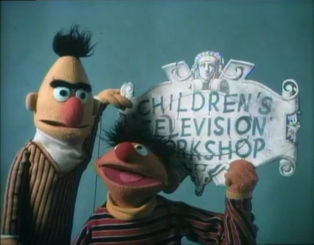 CLOSING SIGNS | Maria holds the Sesame Street sign, while Bert and Ernie hold the CTW sign. |