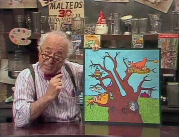SCENE 3 | Mr. Hooper is about to whip up some pancakes at his store when his wooden spoon reminds him of a game. He shows the viewer some pictures, and asks them to find the shape of a spoon hidden in each one. |