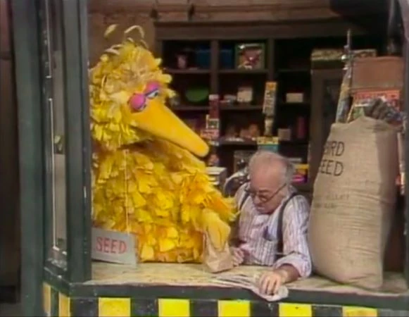 SCENE 4 | Big Bird thinks about what heβd like to be when he grows up. He imagines himself as a birdseed salesman, pushing a cart of bagged seed and hawking it to Susan, but she doesn't care for any. He then tries to sell some to Mr. Hooper (briefly doing an impression of Lefty the Salesman while doing so), but he also doesn't want it as he already has a big bag of it to sell. Mauricio turns him down as well, as he would rather have sandwiches for his lunch. Back in reality, Susan sees Big Bird moping over his potential failure to sell birdseed, and suggests he imagine selling birdseed to birds instead of people. In his fantasy, Big Bird successfully sells some bags of seed to Little Bird (Jerry Nelson) and a small group of flying canaries. After the fantasy, Susan mentions that she could also use some birdseed for Pete, her pet parakeet. |