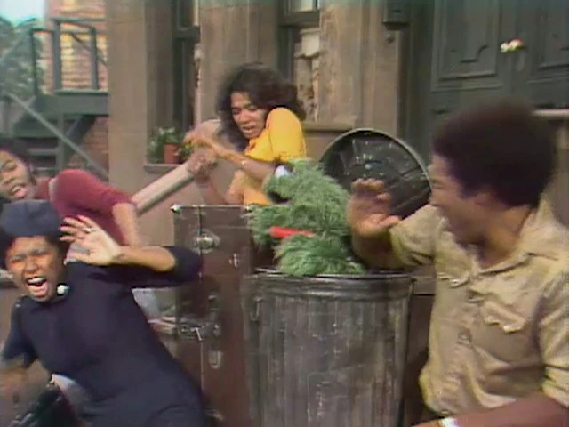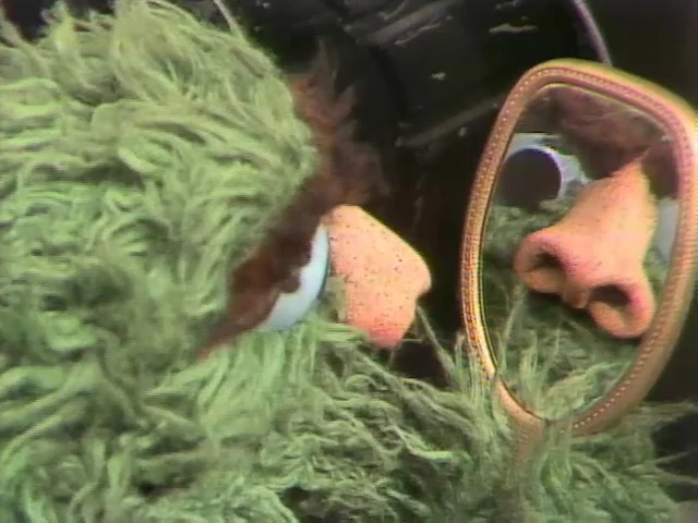 SCENE 1 | Oscar the Grouch points a water pistol at the viewer and proclaims that today he's going to be as rotten as he has ever been. When he sees someone approaching, he crouches down in his trash can to await his victim. When she's within range, Oscar springs up and shouts, "Hey, Granny! Have a bath!" and proceeds to shoot her in the face with water. When he refuses to let up, the woman (Jerry Nelson) identifies herself as the Wicked Witch of the South Bronx and warns him that she'll put an evil spell on him. Oscar keeps delivering insults and blasting her in the face, so the witch conjurs her magicks and produces a proboscis on Oscar's normally noseless face. He's horrified, but she explains there's only one way to break the spell: he has to do something nice. |