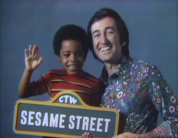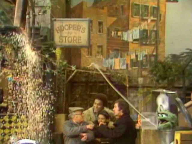 CLOSING SIGNS | Bob and a kid hold the Sesame Street sign, while Maria and Mr. Hooper hold the CTW sign. |