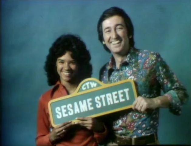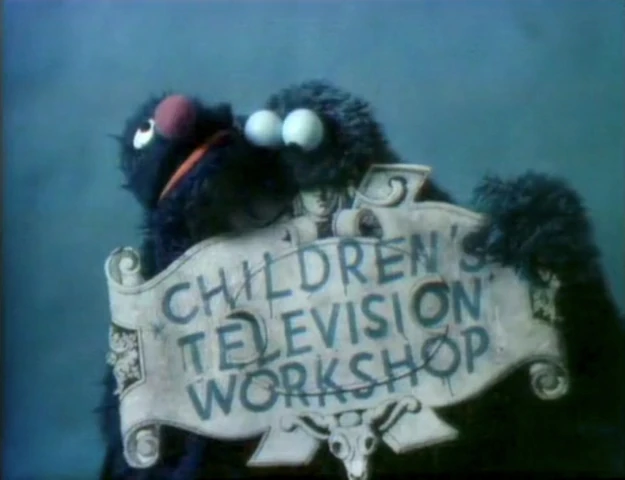 CLOSING SIGNS | Maria and Bob hold the Sesame Street sign, while Grover and Cookie Monster hold the CTW sign. |