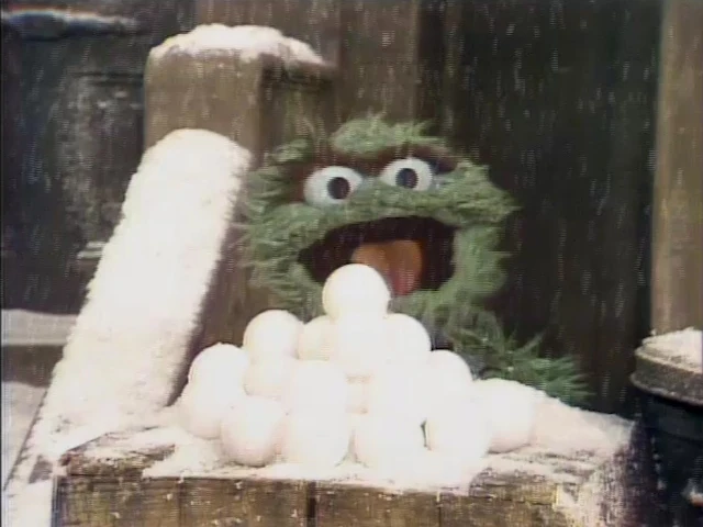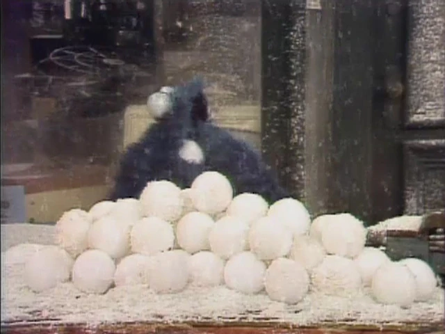 SCENE 8 | Mr. Hooper is in the yard with some snowballs, getting ready for the snowball fight he knows that's coming. Oscar the Grouch has piled more snowballs near his can for the inevitable fight. Cookie Monster says that he has gathered the most amount of snowballs because... "snowballs delicious!" He proceeds to eat them all. |