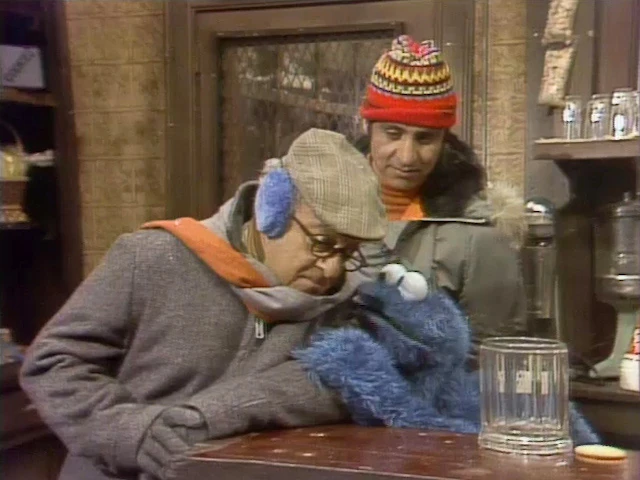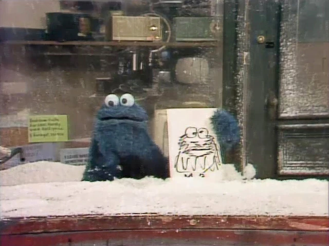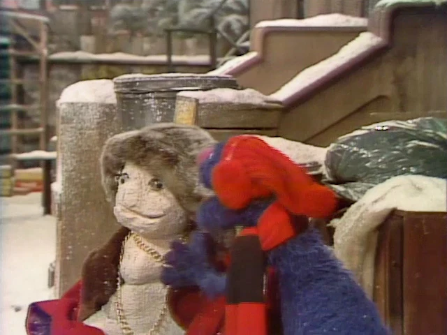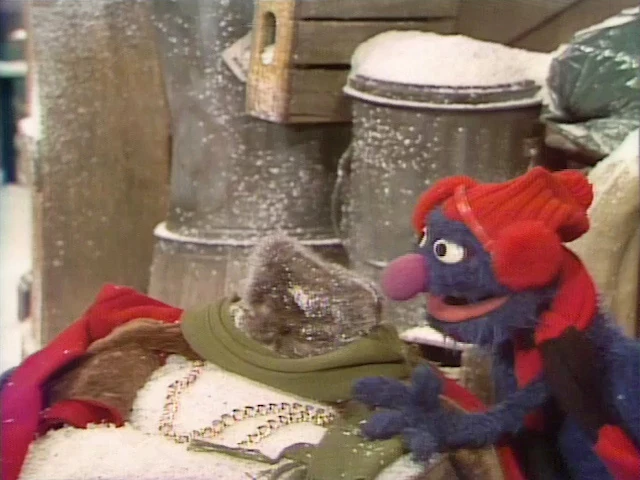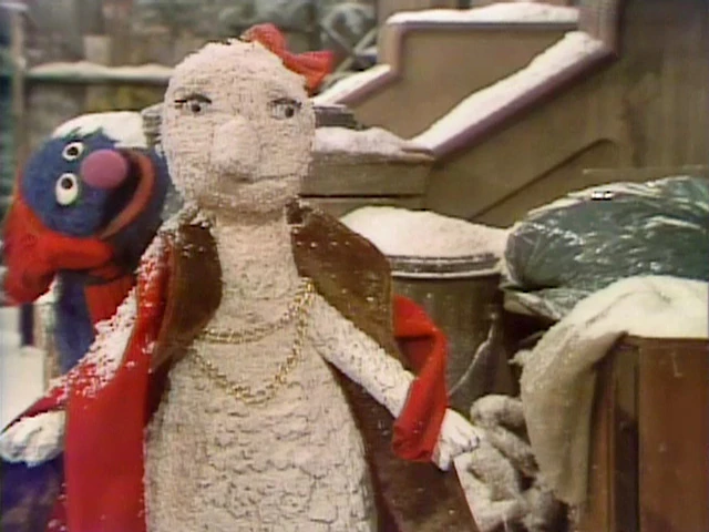 SCENE 2 | Grover is out walking in the snow with his earmuffs and scarf, when he happens upon a female version of himself made out of snow in the yard. Stricken by her beauty, Grover approaches her and tries to carry on a conversation with her, but finds that she's really the silent type. Getting cold standing around in one spot, he invites her to go in Hooper's Store for a cup of hot cocoa. He tries to take her hand, but finds that her hands are like ice. Promising to warm her up, he tells her not to go away, and rushes off. |