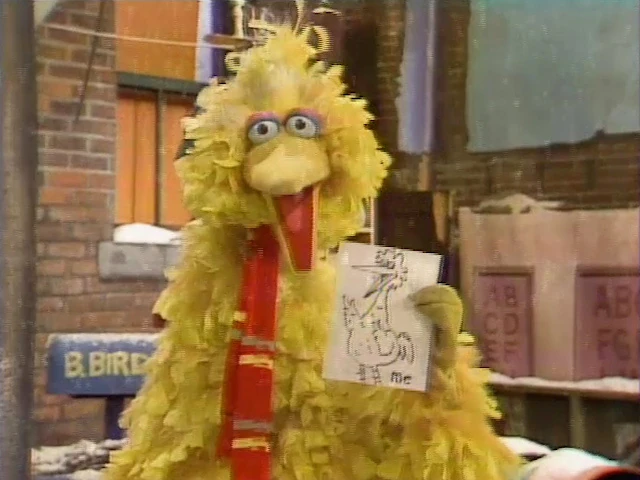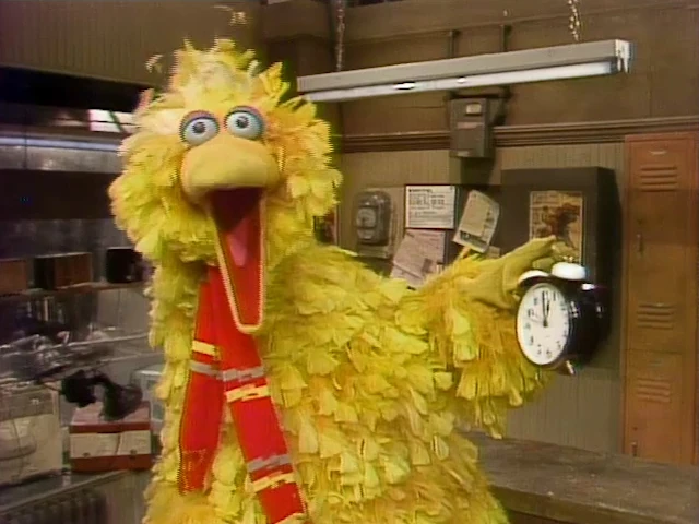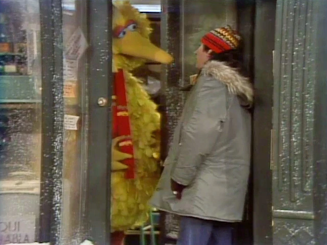 SCENE 7 | Big Bird doesn't want to accompany Luis on an errand because it's too cold outside, so he waits in the Fix-It Shop. Luis is worried Big Bird will try to help customers on his own, so he's closing up shop just for a few minutes, and instructs him not to let anyone in. While Big Bird sits in the shop alone, he notices all the sounds he can hear in the relative quiet. He begins with the ticking of the clock, until he can hear someone wiping the snow off their feet at the door. Luis has returned and tries to get in, but he's locked himself out. Big Bird points out all the sounds he makes trying to get in, and eventually tells him he'll have to wait outside for a few minutes until the shop opens again. |
