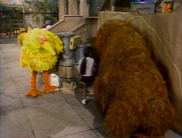 SCENE 1 | Maria and Susan have Willard, Karen and Cathy stand against a large sheet of brown paper, and use chalk to draw the kids' outlines. They demonstrate big, bigger, and biggest with the finished result when Big Bird arrives, admiring their work. Once the grown-ups leave, Mr. Snuffleupagus shows up and observes the artwork, and Big Bird gets the idea to do an outline of Snuffy next. He and the kids begin to put up a new piece of paper as Snuffy tries to contain his excitement. |