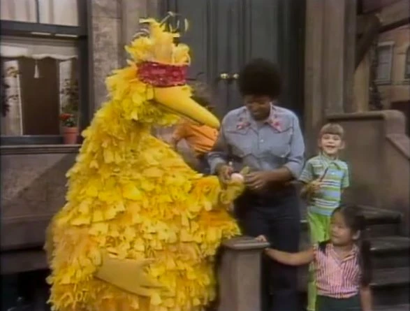 SCENE 5 | Susan leads Big Bird and the kids in a touching game, where Big Bird is blindfolded and tries to guess what the kids hand him - first an egg, then a bar of soap, then a toothbrush. Big Bird now wants Susan to be the one blindfolded, and he and the kids look for things for the game. |