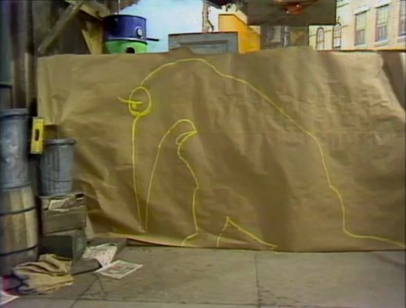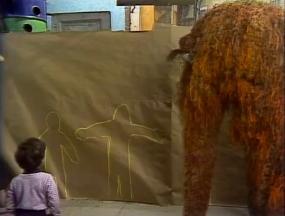 SCENE 2 | Snuffy admires the outline of him that the kids have drawn. As Big Bird goes to fetch Maria in the yard, Snuffy goes home briefly to tell his mommy about it. When Big Bird shows the outline to Maria, she still doesn't believe that the Snuffleupagus is real. |