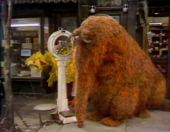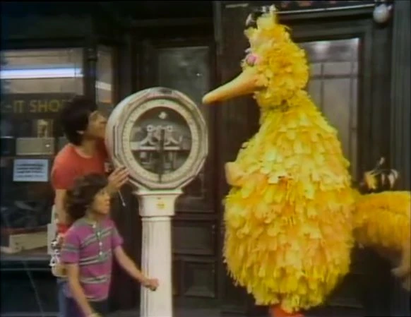 SCENE 4 | At the Fix-it Shop, Luis finishes fixing a scale and tells Big Bird he has to go down to the basement to pick up some things. While Luis is away, Snuffy returns for his outline picture. This time, Big Bird decides to stay with Snuffy while Lance goes in the shop to get Luis. Once Lance is gone, Snuffy sees the scale and wants to know how much he weighs, but after stepping just one foot onto it, the scale rotates like mad and completely breaks down, popping springs and pieces everywhere. Snuffy leaves upon Big Bird's suggestion (Snuffy:"Oh, little furry tootsie-hoofs, take me home in a hurry!"), and a very furious Luis thinks Big Bird broke the scale. |