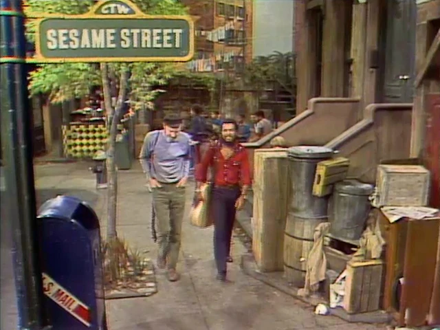 SCENE 7 | Bob announces the sponsors, as Jimmy and Pete walk down the street to their vocalized rendition of the "Sesame Street Theme" accompanied by banjo and guitar. |