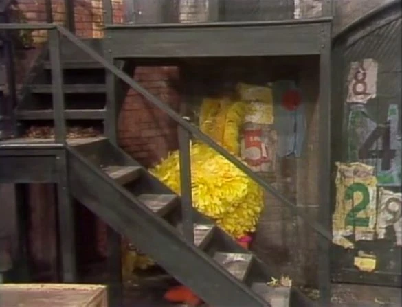 SCENE 1 | Big Bird tries to demonstrate in, on, and under, but has a difficult time. In his search, he can't find anything in the garage, under the stairs or the table outside, on David's stool in Hooper's Store, under the newspapers, on the fire hydrant, or on Maria's and Susan's heads. "You know, some things are impossible to teach," he remarks. |