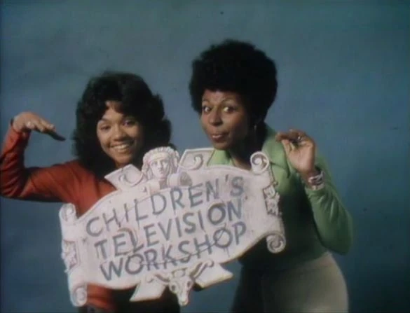 CLOSING SIGNS | David and a kid hold the Sesame Street sign, and Maria and Susan hold the Children's Television Workshop sign. |