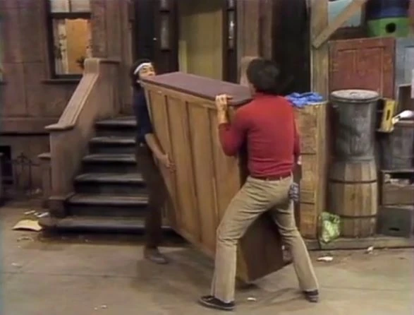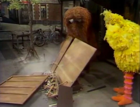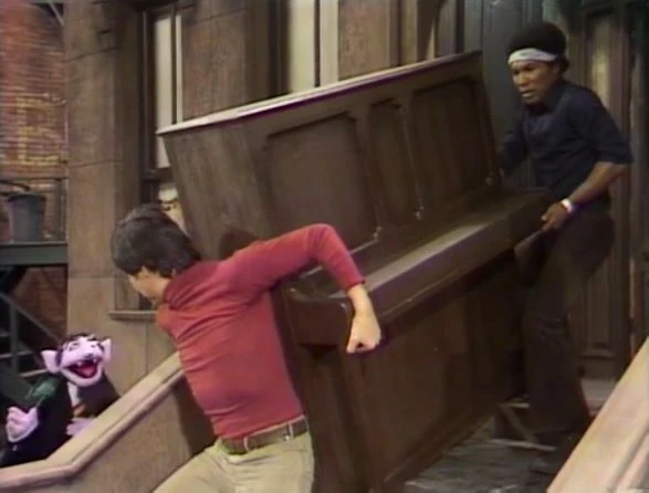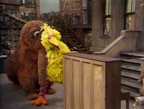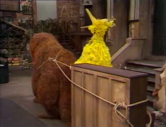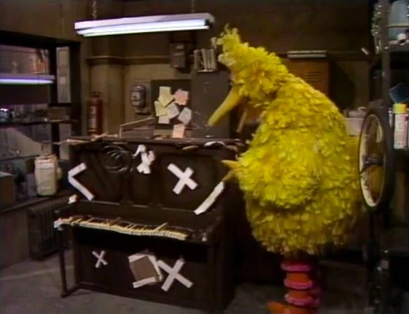 SCENE 3 | Gordon and Luis leave the piano outside to be taken away by the sanitation department, then leave for some sodas. Big Bird and Mr. Snuffleupagus encounter the piano, and notice it’s out of tune. Big Bird assumes it should be taken to the Fix-it Shop and decides to move it there, but he and Snuffy aren't able to get the piano to budge. |