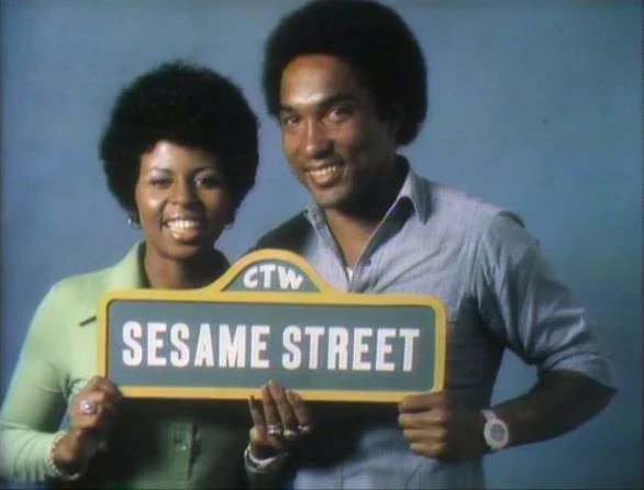 CLOSING SIGNS | Gordon and Susan hold the Sesame Street sign, and Luis holds the Children's Television Workshop sign. |