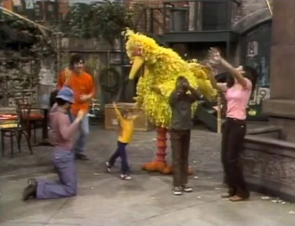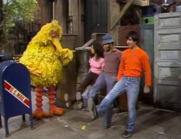 SCENE 1 | David tunes his radio to some funky music which he and the others dance to. Big Bird is surprised to learn that the kids are teaching the grown-ups some new moves: Reggie shows Maria how to do "the Basketball" while Shaun and Luis step in time, and David and Joey flail their arms and legs. Big Bird feels he's too clumsy to join but eventually gives in and starts having a ball, bobbing his head back and forth and criss-crossing his legs. The others start calling his dance "the Big Bird." |