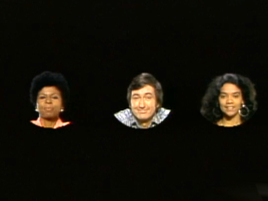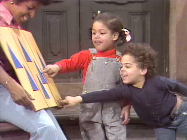 CLOSING SIGNS | Maria and Susan hold the Sesame Street sign, and Bob and the kids hold the Children's Television Workshop sign. |